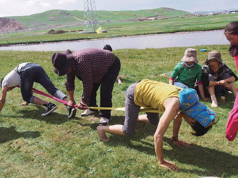 首に綱をかけて行う綱引き