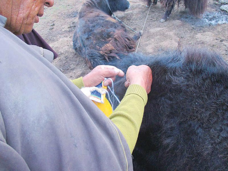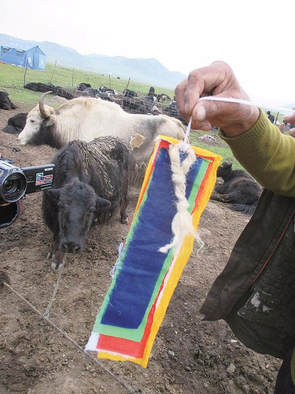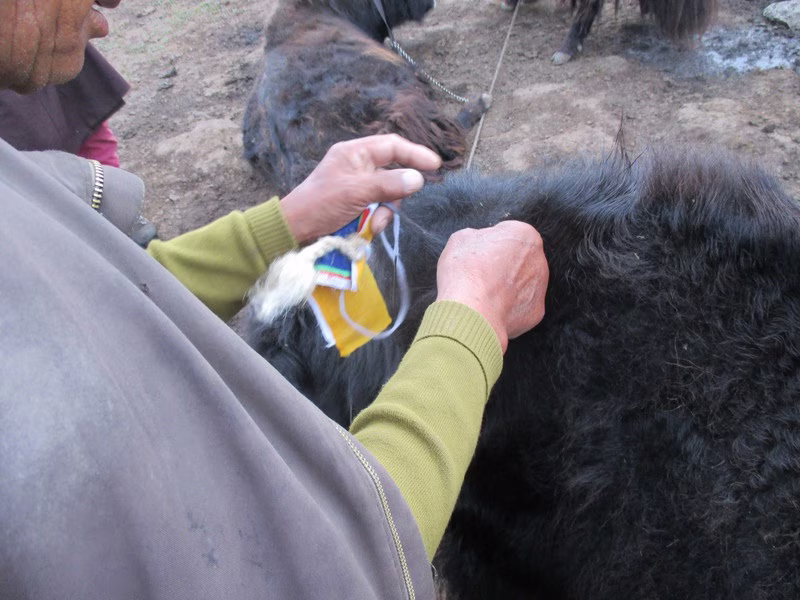 健やかに育つことを祈り、ヤクの剛毛を0-1歳の仔ヤクの耳に結びつける。かつてはアナグマの皮を結びつける習慣もあったという。