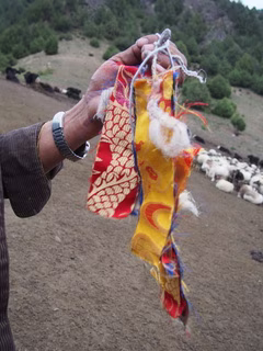 放生用の家畜の肩の毛に結びつける目印の紐。