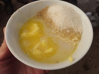 トマ芋の溶かしバターがけは、トマ芋を鍋で煮た後、茶碗によそい、その上に白砂糖や黒砂糖をかけ、溶かしバターを注いだ食べ物である。甘く、そして、栄養豊富なすばらしい食べ物だ。トマ芋を食べ終わった後で茶碗の底に溶かしバターがたまっていたら、その中にツァンパを入れて食べる。このすばらしい食べ物は、栄養不足による気虚、血のめぐりが悪いことによる疲労、高齢者の体を養生するなどの効用がある。